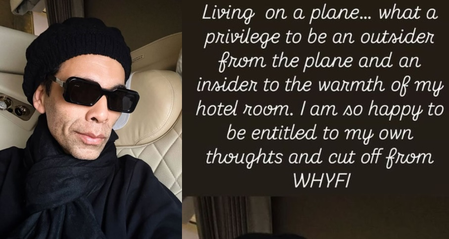 Karan took to his Instagram stories, where he shared a selfie from the business class of the airplane along with the picture he wrote a tongue in cheek comment about the “insider and outsider” debate that often takes place in Bollywood.
